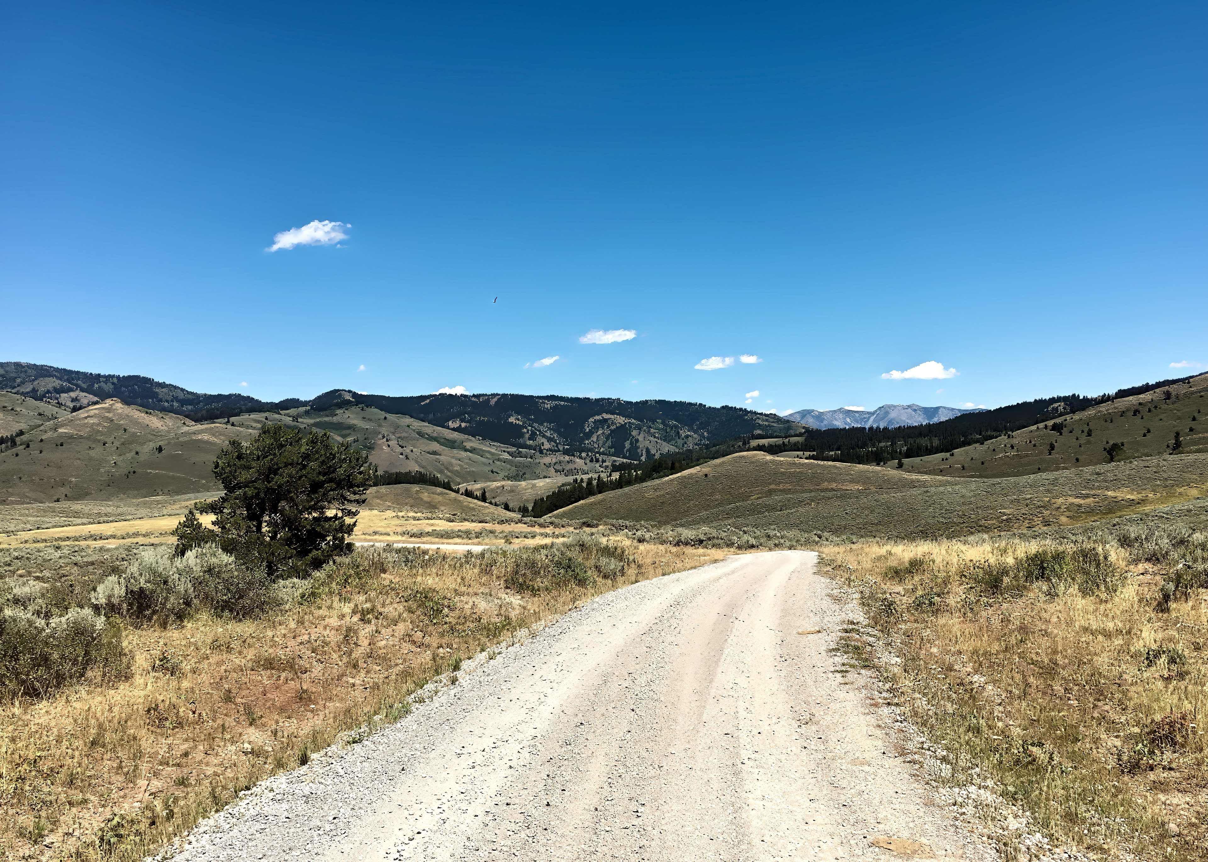 A winding gravel road cuts through remote hills under a blue sky in rural Wyoming, capturing the spirit of open roads and western landscapes.