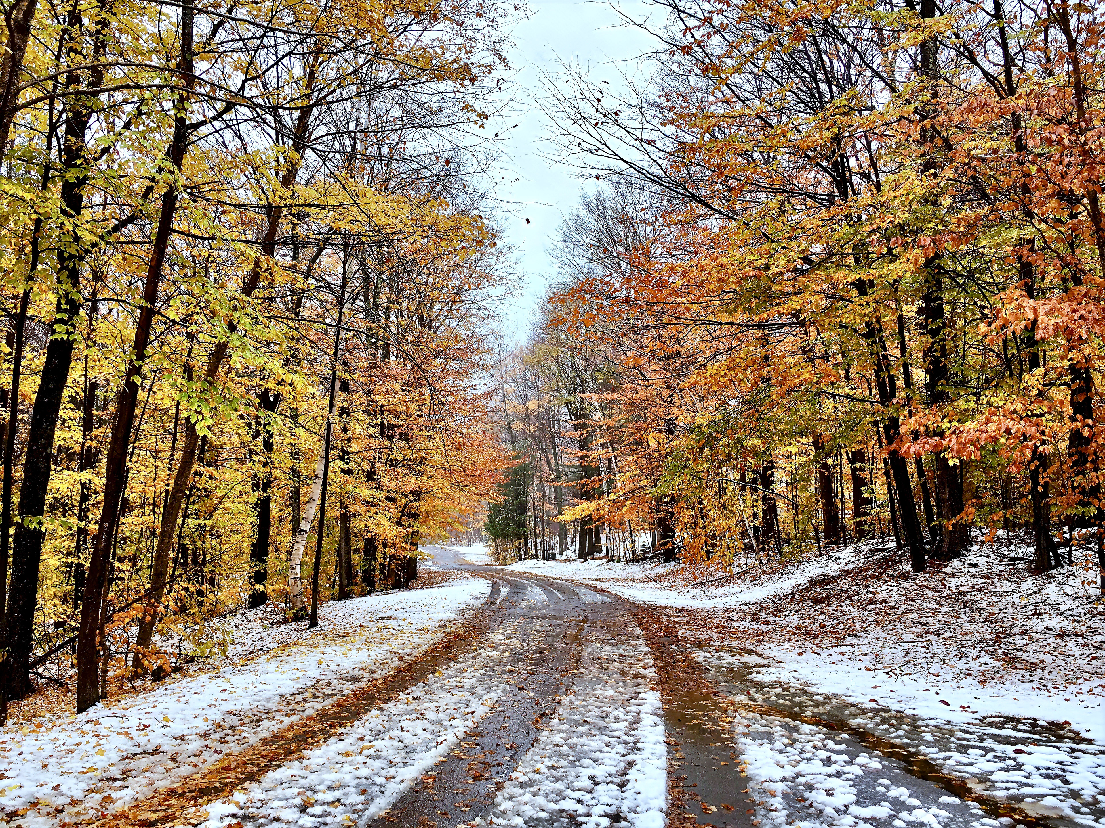 Stowe, Vermont — October snowfall drapes the last of the autumn color in silence and contrast.