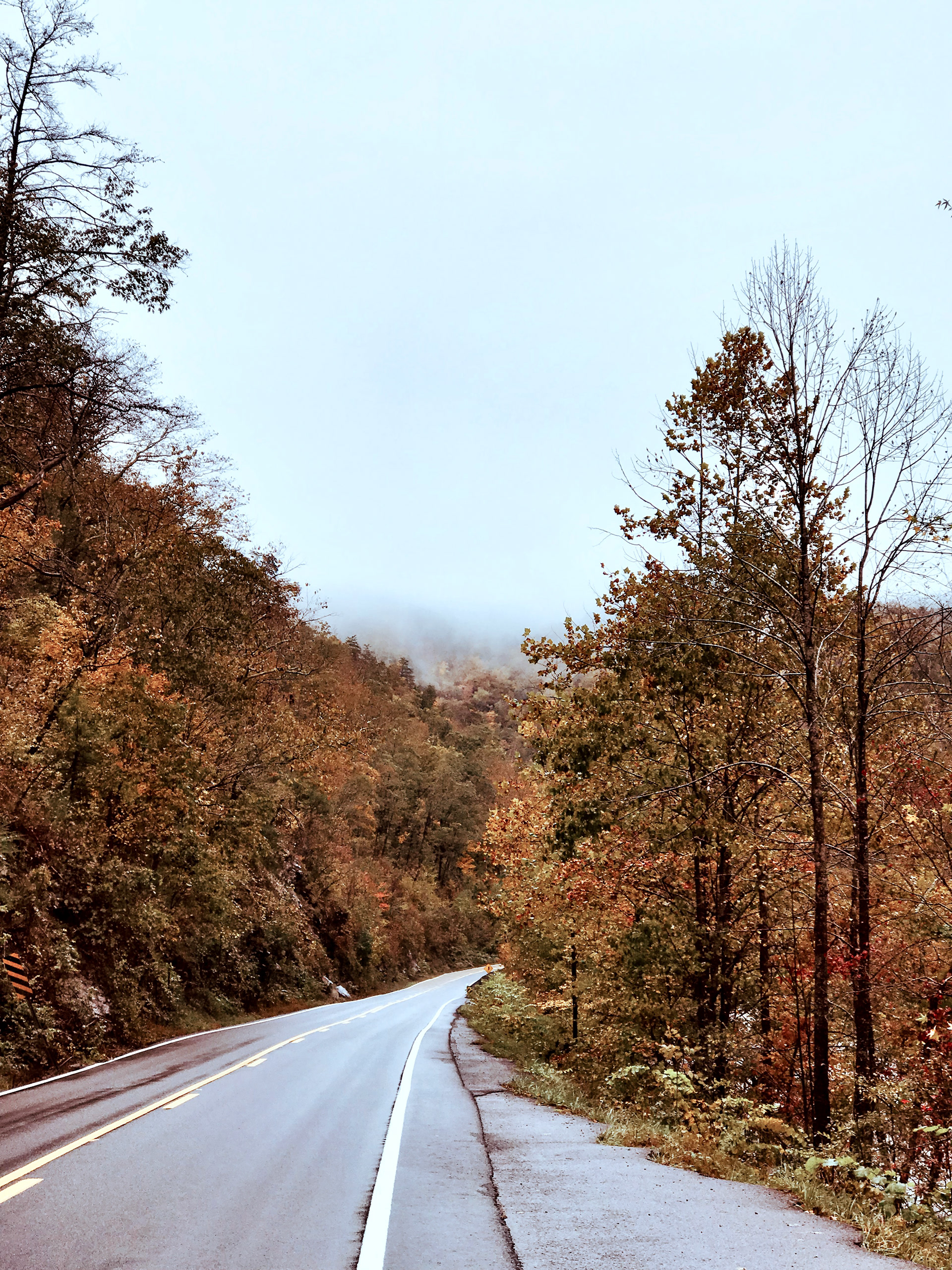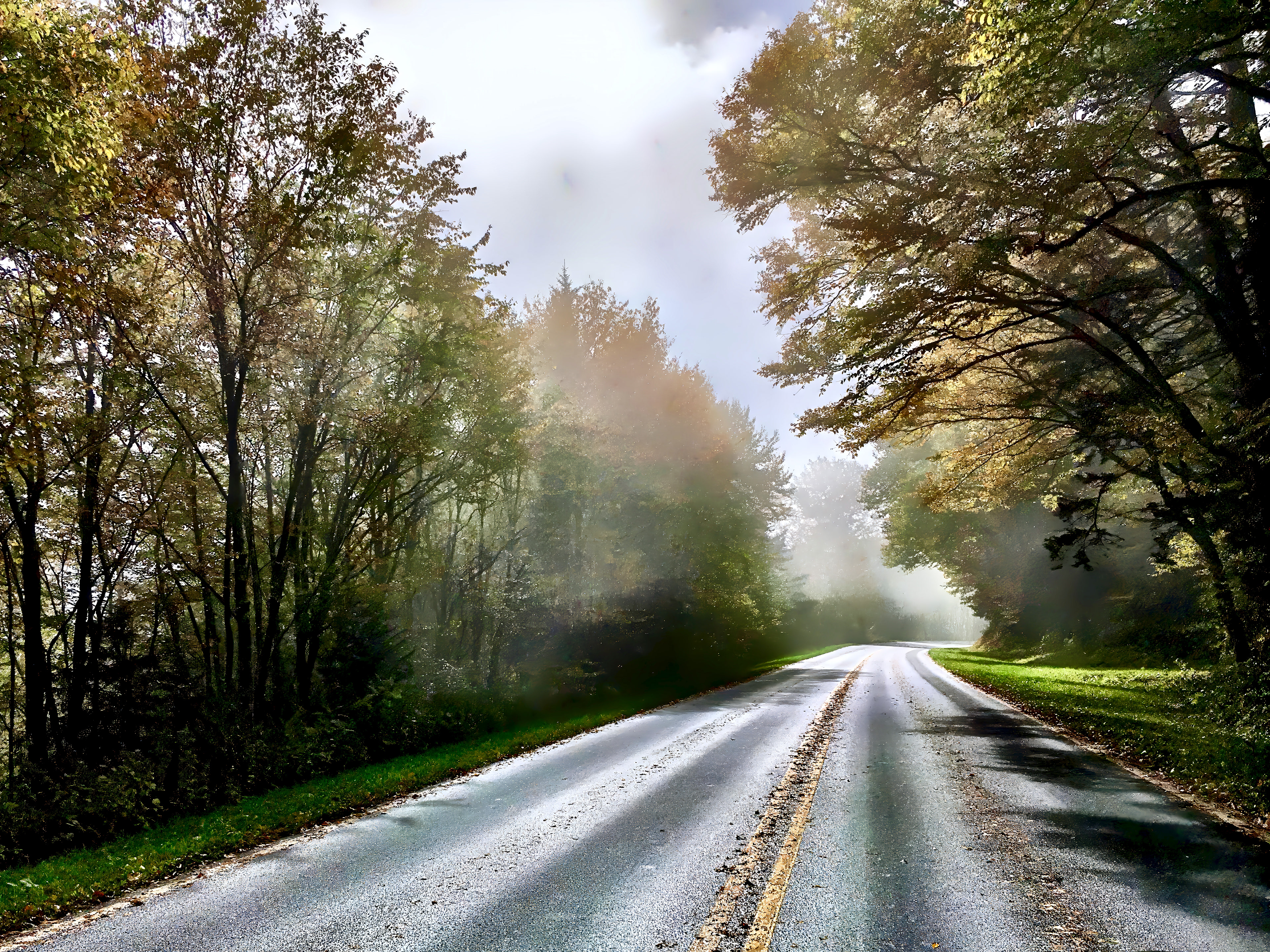 Into the Quiet: Bryson City, North Carolina — where the road curves gently into the fog, and fall’s first chill clings to the trees like a memory.