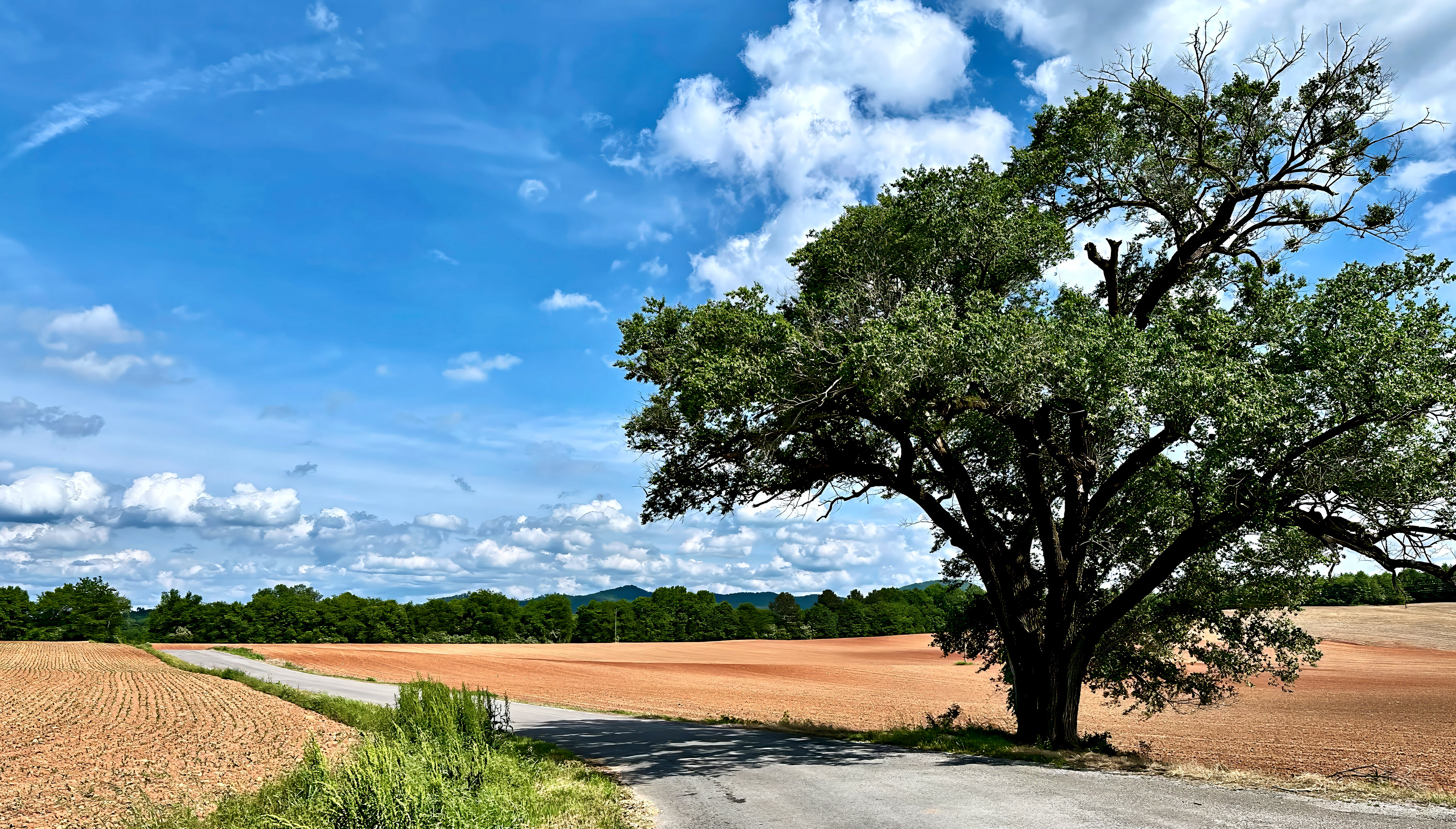 Fork in the Field: A winding road cuts through Old Fort, Tennessee — where quiet curves, wide skies, and a lone tree mark the path between farmland and foothills..