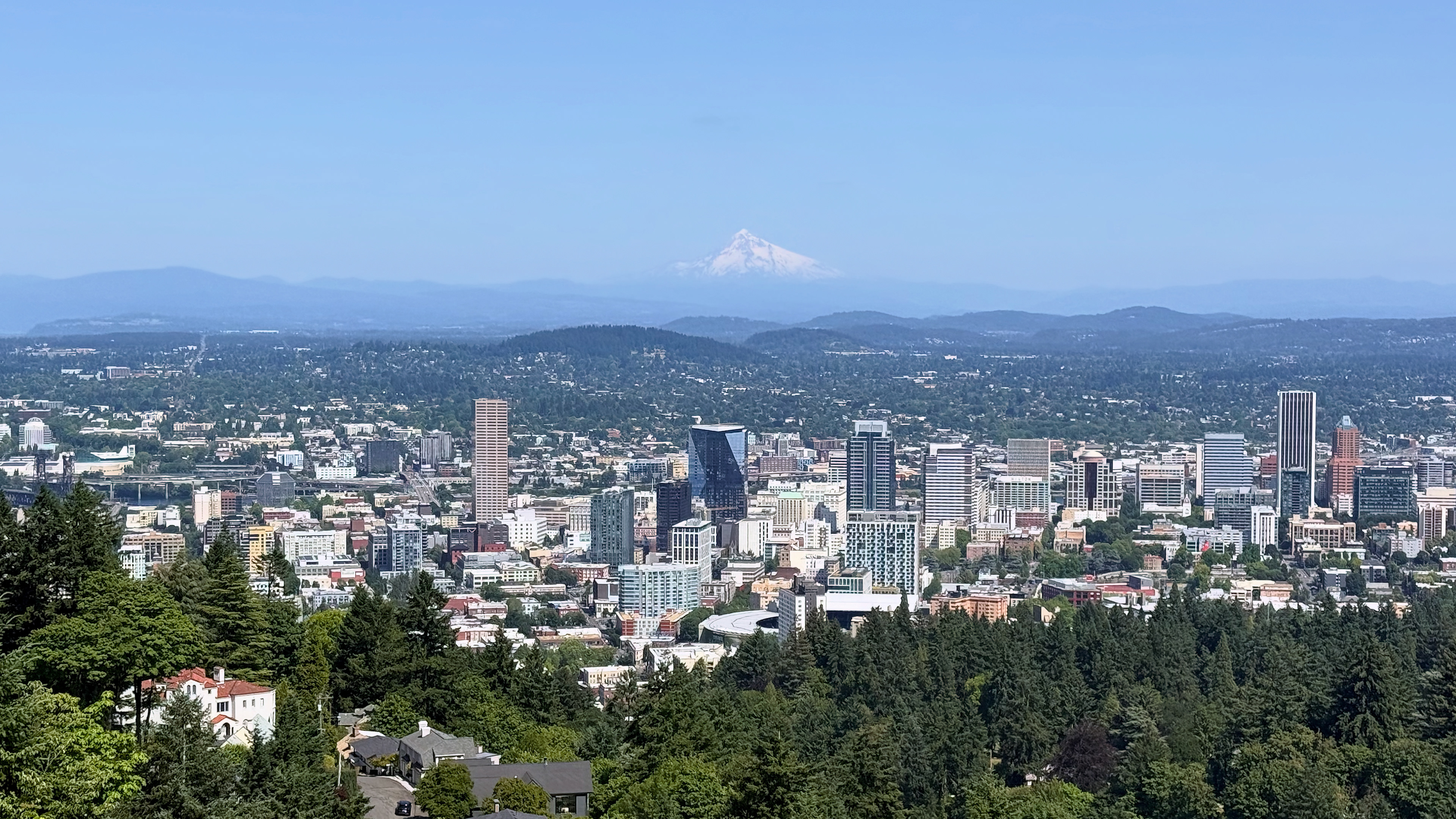 A crisp view of downtown Portland, Oregon, with Mount Hood rising in the distance on a clear summer day. Taken from Pittock Acres Park showcasing the urban skyline.