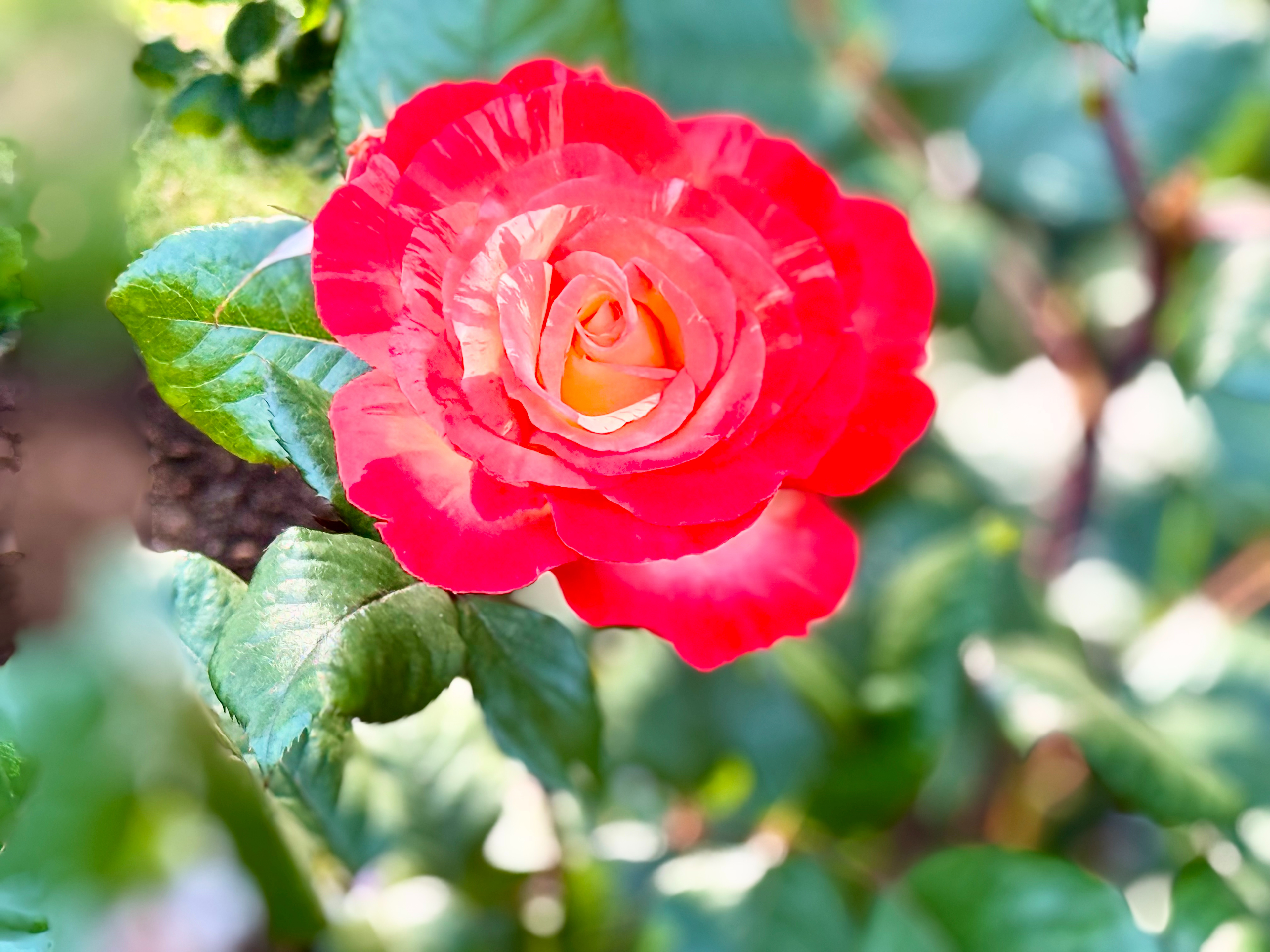 A vibrant red and yellow rose in full bloom at Washington Park in Portland, Oregon.